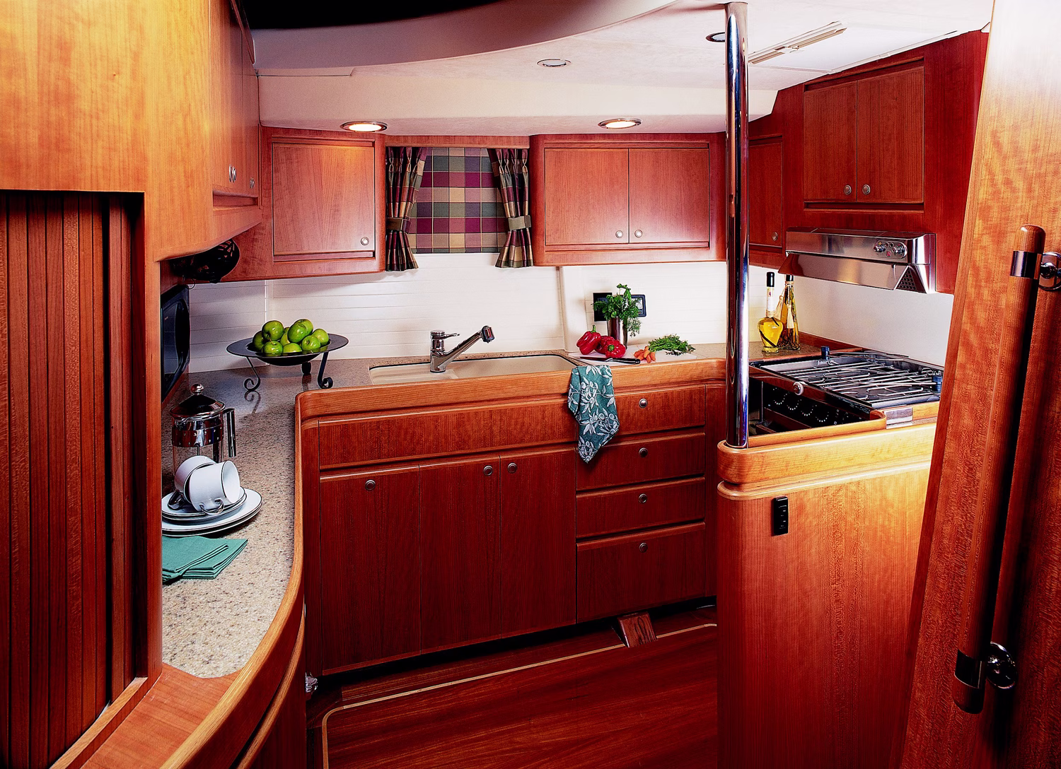 Going forward and down from the pilot area, the dining area is to starboard, the bar is to port, and the galley forward of the bar. Further forward are the full size double cabins of similar size and proportions. The midship area has the engine room under the cockpit and pilothouse. Aft of the pilothouse is a hallway with storage and lockers leading to the largest cabin. There is storage forward for sails, windsurfers, and equipment in the forepeak. Aft there is a hydraulically operated transom door with stowage for outboard engines and diving gear.