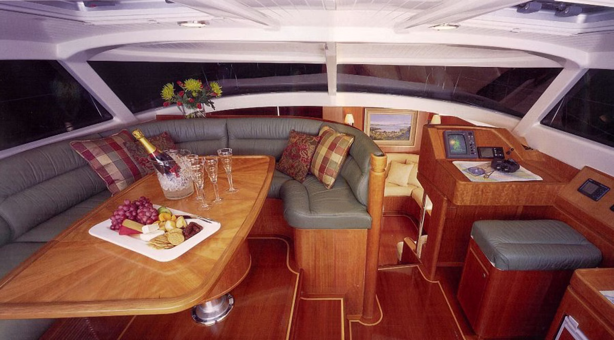 The raised pilot/salon area allows for sailing the boat in uncomfortable conditions in a comfortable environment, with inside lounging and steering areas. Immediately aft of the pilothouse is the cockpit sheltered by the pilothouse and surrounded by dual coamings. The pilothouse gives the inside space of the boat visual access to the cruising grounds, and lapping the house glass over the lower salon draws the lower deck into the upper areas of the boat.
