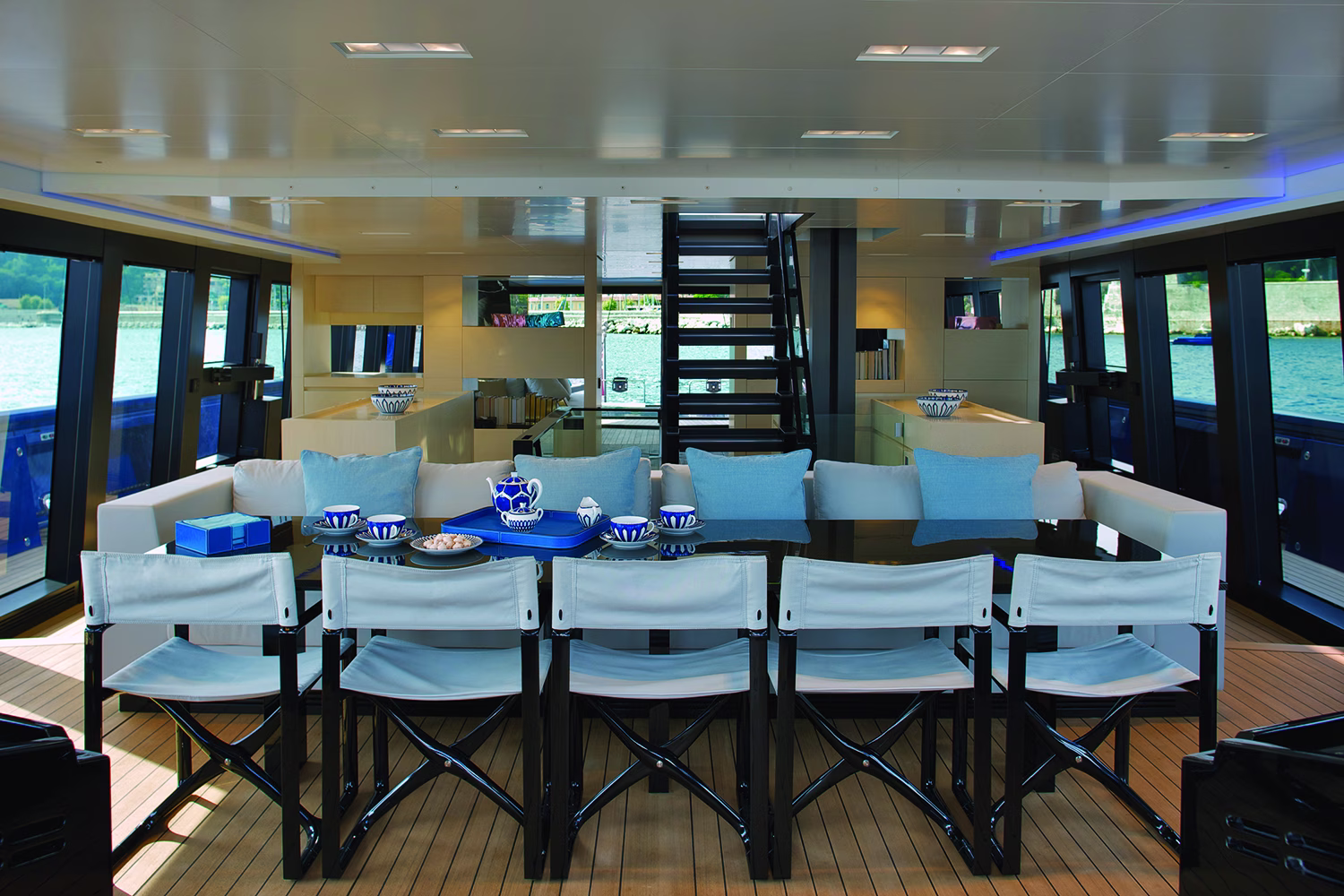 To enhance the Wally inside-outside living concept, a 360° transparent glass encloses the deckhouse providing the guests with the view and open-air feeling when they are in the salon. The deckhouse encloses the main salon aft and dining area forward; and a twin navigation stations at the forward end. All the living spaces are characterised by the open space loft and flexibility concept to change configurations according to the use and requirements of different moments.